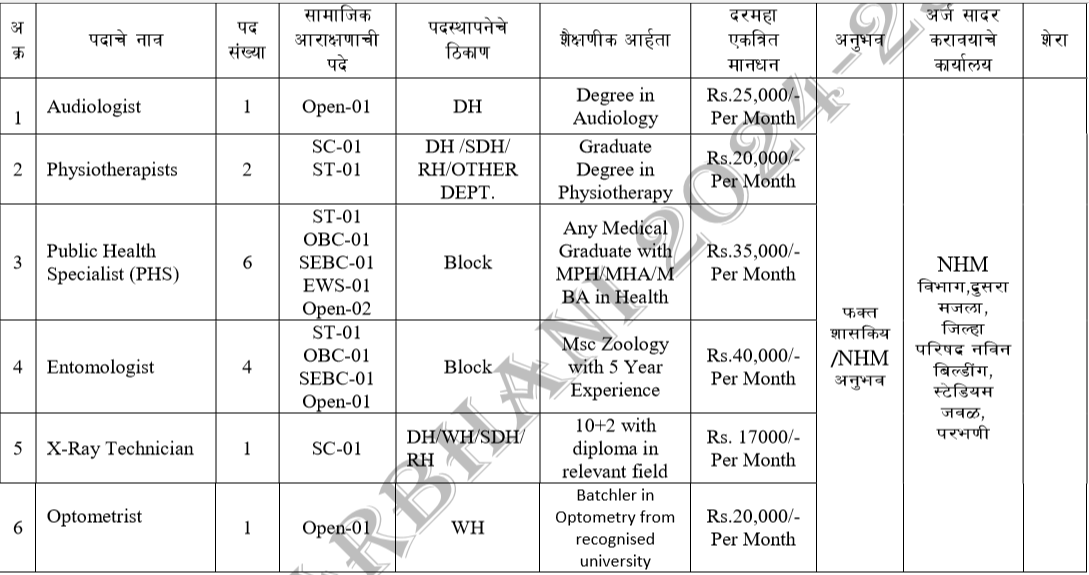 - अर्जाचा पत्ता – राष्ट्रीय आरोग्य अभियान विभाग, २ रा मजला, जिल्हा परिषद नवीन इमारत, स्टेडियमजवळ, परभणी.