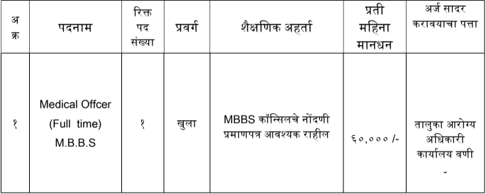 - अर्जाचा पत्ता – तालुका आरोग्य अधिकारी यांचे कार्यालय, वणी, जि. यवतमाळ.