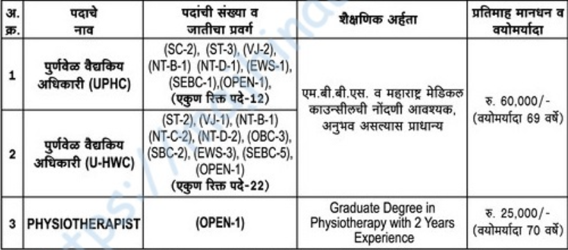 | शैक्षणिक पात्रता आणि अनुभव | एमबीबीएस. (शैक्षणिक पात्रताकरिता PDF/वेबसाईट बघावी) |