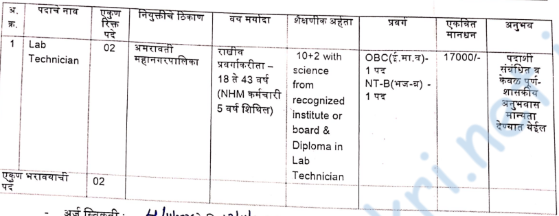 - Address for application – National Health Mission, Public Health Department (Receipt-Dispatch Section, Last Room), Amravati Municipal Corporation, Above Punjab National Bank, 2nd Floor, Rajkamal Square, Amravati – 444601.
