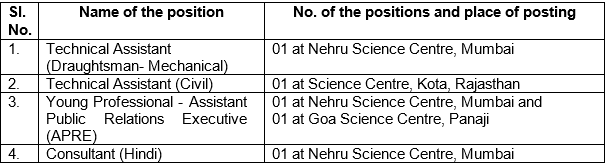 NSC Mumbai Recruitment 2026 – Nehru Science Centre, Mumbai invites Offline applications in prescribed format till last date 02/05/2026 for the post of Technical Assistant (Draughtsman- Mechanical) (Civil), Young Professional – Assistant Public Relations Executive (APRE) and Consultant (Hindi) for Science Centres at Mumbai, Kota & Panaji. There are total 5 vacancies. The job location is Mumbai, Kota & Panaji. The Official website & PDF/Advertise is given below.
