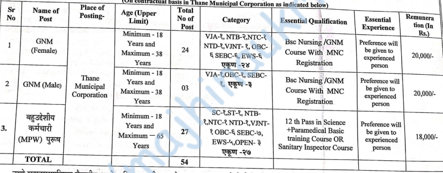 TMNC NUHM 15th FC GNM Recruitment 2025 – Medical Health Officer, Thane Municipal Corporation, Thane invites Online & Offline applications in prescribed format till last date 28/10/2025  for the posts of GNM (Male & Female) under 15th Finance Commission & National Urban Health Mission. There are total 51 posts. The job location is Thane. The Official website & PDF/Advertise is given below.
