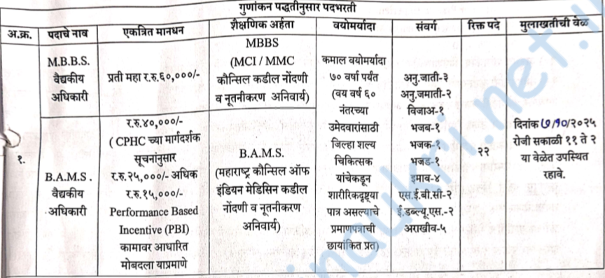 अतिरिक्त आयुक्त महानगरपालिका, पुणे यांनी प्रसिद्द केलेल्या जाहिराती नुसार पुणे आरोग्य विभाग, राष्ट्रीय नागरी आरोग्य अभियान, एकात्मिक आरोग्य आणि कुटुंब कल्याण सोसायटी, महानगरपालिका, पुणे अंतर्गत हिंदूहृदयसम्राट बाळासाहेब ठाकरे आपला दवाखाना येथे वैदयकीय अधिकारी (एमबीबीएस/बीएएमएस) पदभरतीसाठी विहित नमुन्यातील ऑफलाईन अर्ज मागवून दि. ७/१०/२०२५ रोजी मुलाखत आयोजित केली आहे. या भरती अंतर्गत एकूण २२ जागा आहेत. अधिकृत वेबसाईट आणि PDF जाहिरात लिंक खाली दिलेली आहे. “माझी नोकरी” या लिंक वरून टेलिग्राम चॅनल लगेच जॉईन करा.