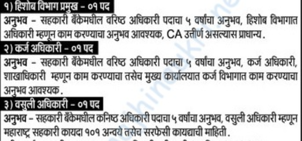 | या पदांसाठी भरती | १) हिशोब विभाग प्रमुख २) कर्ज अधिकारी ३) वसुली अधिकारी |