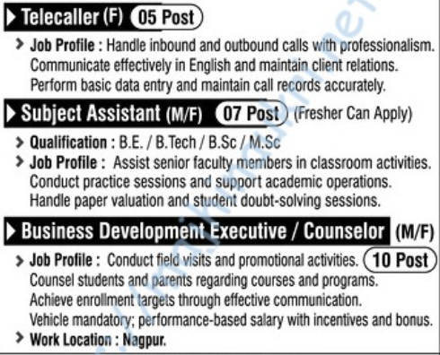 Pyramid Tutorials Recruitment 2025 – Pyramid Tutorials, Nagpur invites Online applications& has arranged interview on date 13/11/2025 to 16/11/2025 to fill up posts of Tellecaller (F), Subject Assistant (M/F) & Business Development Executive/Counsellor (M/F). There are total 22 vacancies. The job location is Nagpur. The Official website & PDF/Advertise is given below.