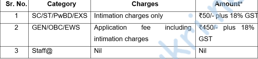 - Application fee – (See table/Refer PDF/Visit website) –