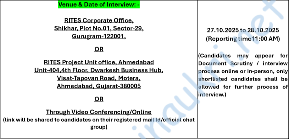 - Venue – RITES Limited, Shikhar, Plot No. 1, Sector 29, Gurugram, Haryana.