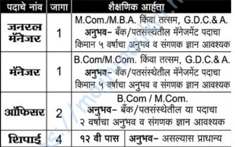 सर्वोदय नागरी सहकारी पतसंस्था मर्यादित, ता. संगमनेर, जि. अहिल्यानगर यांनी प्रसिद्ध केलेल्या जाहिराती नुसार येथे सरव्यवस्थापक, व्यवस्थापक, अधिकारी आणि शिपाई पदभरतीसाठी दि. २०/३/२०२६ पर्यंत ऑनलाईन/ऑफलाईन अर्ज मागवण्यात येत आहेत. या भरती अंतर्गत एकूण ८ जागा आहेत. अधिकृत वेबसाईट आणि PDF जाहिरात लिंक खाली दिलेली आहे. “माझी नोकरी” या लिंक वरून टेलिग्राम चॅनल लगेच जॉईन करा.