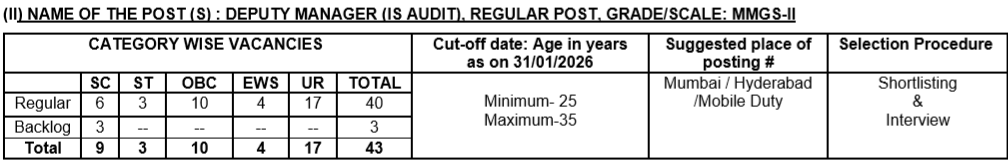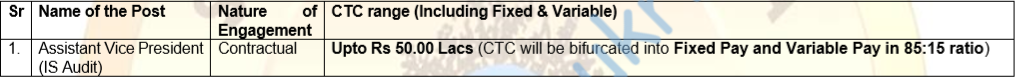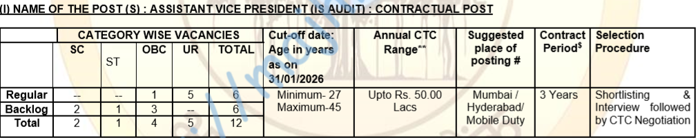या पदांसाठी भरतीविशेषज्ञ श्रेणी अधिकारी – महाव्यवस्थापक (आयएस ऑडिट)/सहाय्यक उपाध्यक्ष (आयएस ऑडिट)