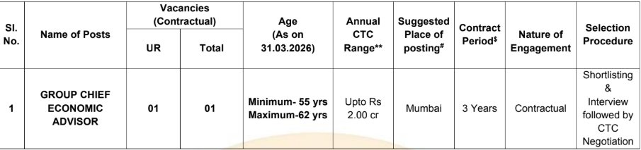 SBI GCEA Job 2026 – State Bank of India invites Online applications in prescribed format till the last date 4/5/2026 for the post of Group Chief Economic Advisor in Specialist Officer cadre. There is 1 post. The job location is Mumbai. The Official website & PDF/Advertise is given below.