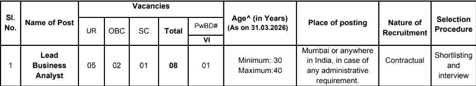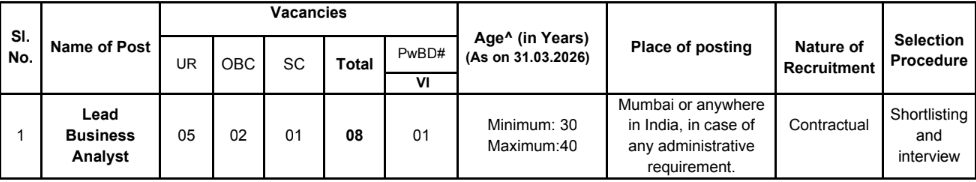 | या पदांसाठी भरती | विशेषज्ञ श्रेणी अधिकारी – लीड बिझनेस एनालिस्ट ![]() |
