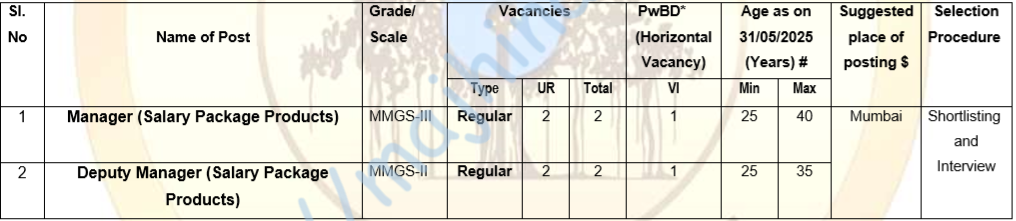| या पदांसाठी भरती | विशेषज्ञ श्रेणी अधिकारी – व्यवस्थापक/उपव्यवस्थापक (सॅलरी पॅकेज प्रॉडक्ट डिसिप्लिन)  |