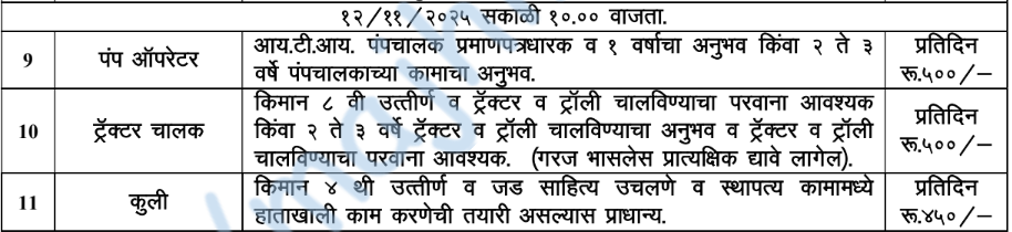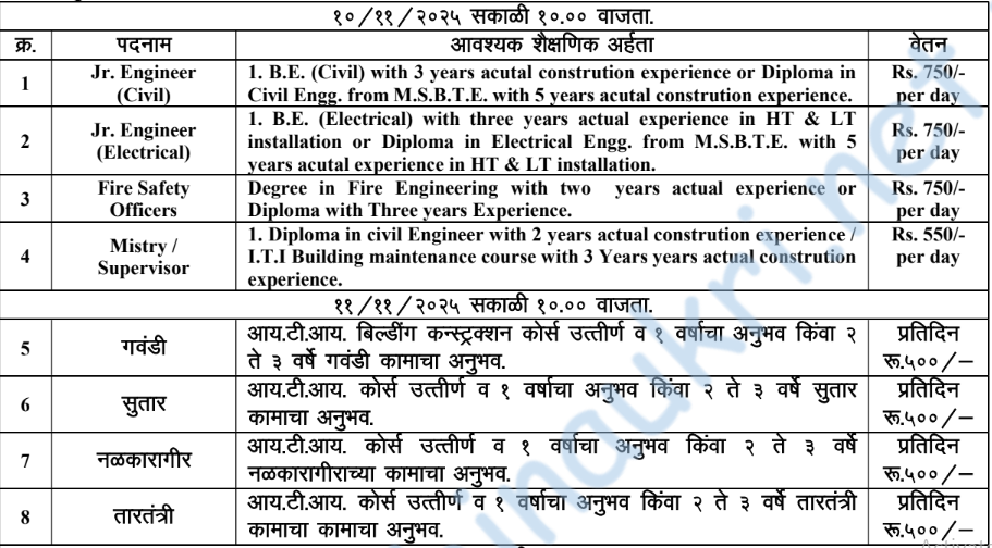 - मुलाखतीची तारीख आणि वेळ – दि. १०/११/२०२५, दि. ११/११/२०२५ आणि दि. १२/११/२०२५ सकाळी १०.०० वाजता. (सविस्तर माहितीसाठी तक्ता पहा/PDF/वेबसाईट बघावी)