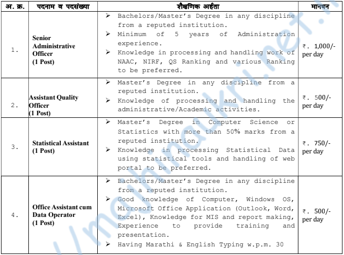 - पदांचा तपशील, अटी आणि शर्ती, विहित नमुना अर्ज, अर्जासोबत जोडावयाची आवश्यक कागदपत्रे, अर्ज प्रक्रिया, निवड प्रक्रिया, आरक्षण, पात्रता निकष यांच्या विस्तृत माहितीसाठी, इतर माहितीसाठी PDF पहा आणि http://www.unishivaji.ac.in/ किंवा http://www.unishivaji.ac.in/recruitments/ येथे भेट दया.