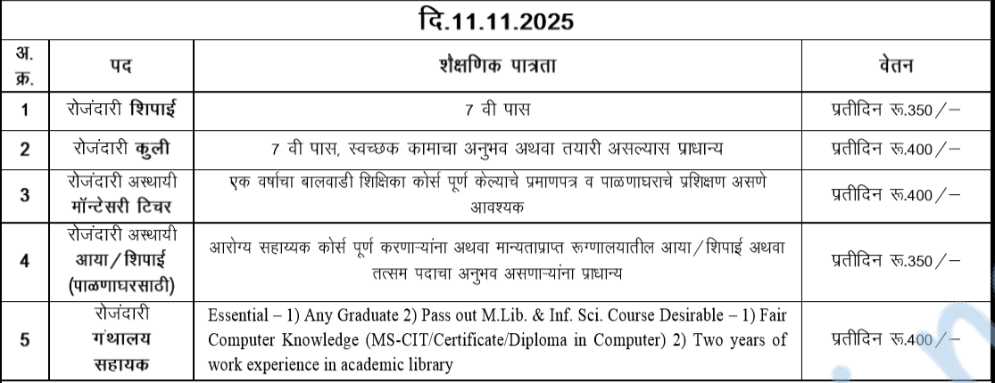 - मुलाखतीची तारीख आणि वेळ – दि. ११/११/२०२५ सकाळी १०.०० वाजता. (सविस्तर माहितीसाठी तक्ता पहा/PDF/वेबसाईट बघावी)