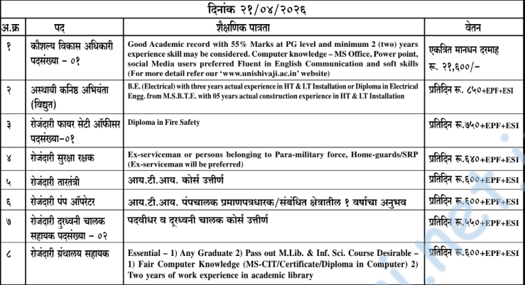- पदांचा तपशील, अटी आणि शर्ती, विहित नमुना अर्ज, अर्जासोबत जोडावयाची आवश्यक कागदपत्रे, अर्ज प्रक्रिया, निवड प्रक्रिया, आरक्षण, पात्रता निकष यांच्या विस्तृत माहितीसाठी, इतर माहितीसाठी PDF पहा आणि http://www.unishivaji.ac.in/ किंवा http://www.unishivaji.ac.in/recruitments/ येथे भेट दया.