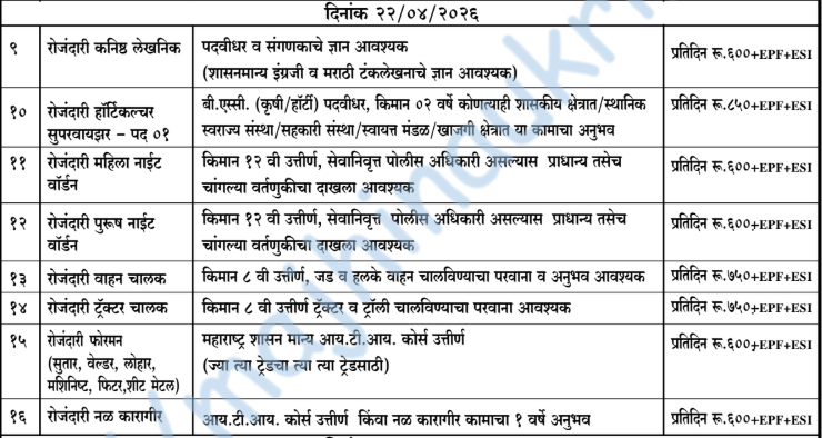 शिवाजी विदयापीठ, कोल्हापूर यांनी प्रसिद्द केलेल्या जाहिराती नुसार त्यांचे कार्यालय येथे रोजंदारी/एकत्रित मानधनावर विविध शिक्षकेतर पदभरतीसाठी विहित नमुन्यातील ऑफलाईन अर्ज मागवून दि. २१/४/२०२६, दि. २२/४/२०२६ आणि दि. २३/४/२०२६ रोजी मुलाखत आयोजित केली आहे. अधिकृत वेबसाईट आणि PDF जाहिरात लिंक खाली दिलेली आहे. “माझी नोकरी” या लिंक वरून टेलिग्राम चॅनल लगेच जॉईन करा.