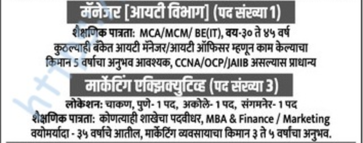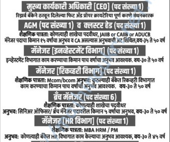 दि संगमनेर मर्चंट्स को ऑपरेटिव्ह बँक लि., संगमनेर यांनी प्रसिद्द केलेल्या जाहिराती नुसार त्यांच्या विविध शाखा येथे मुख्य कार्यकारी अधिकारी, सहाय्यक महाव्यवस्थापक, क्लस्टर हेड, विपणन कार्यकारी आणि विविध व्यवस्थापक पदभरतीसाठी दि. १०/११/२०२५ पर्यंत ऑनलाईन अर्ज मागवण्यात येत आहेत. या भरती अंतर्गत एकूण १६ जागा आहेत. अधिकृत वेबसाईट आणि PDF जाहिरात लिंक खाली दिलेली आहे. “माझी नोकरी” या लिंक वरून टेलिग्राम चॅनल लगेच जॉईन करा.