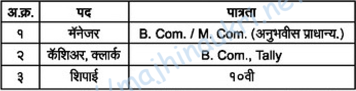 स्वातंत्र्यसैनिक स्वर्गीय श्री. शिवाजी नाथाजी पाटील ग्रामीण बिगर शेती सहकारी क्रेडिट संस्था मर्यादित, कळंबे तर्फ कळे, ता. करवीर, जि. कोल्हापूर यांनी प्रसिद्ध केलेल्या जाहिराती नुसार येथे व्यवस्थापक, रोखपाल/लिपिक आणि शिपाई पदभरतीसाठी दि. ३/११/२०२५ रोजी मुलाखत आयोजित केली आहे. अधिकृत वेबसाईट आणि PDF जाहिरात लिंक खाली दिलेली आहे.  “माझी नोकरी” या लिंक वरून टेलिग्राम चॅनल लगेच जॉईन करा