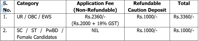 - Application fee – Rs. 1000/- (General/OBC/EWS Candidates) (SC/ST/PWD/Female candidates are exempted from payment of application fee). (For detail procedure of application fee payment refer PDF/visit website)