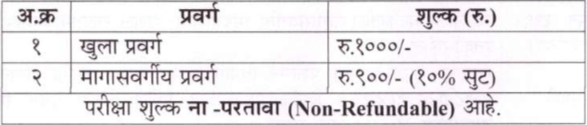 - अर्ज शुल्क – (अर्ज शुल्क भरणा प्रक्रियेविषयी सविस्तर माहितीसाठी तक्ता पहा/PDF/वेबसाईट पहा) –