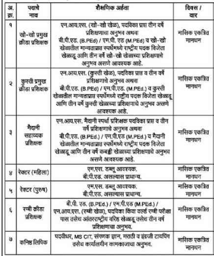 पदांचा तपशील खो-खो प्रमुख क्रीडा प्रशिक्षक, कुस्ती प्रमुख क्रीडा प्रशिक्षक, मैदानी सहाय्यक प्रशिक्षक, रेक्टर (पुरुष, महिला), रग्बी क्रीडा प्रशिक्षक आणि कनिष्ठ लिपिक शैक्षणिक पात्रता किंवा अनुभव शैक्षणिक पात्रतेकरिता जाहिरात/PDF/वेबसाईट बघावी. एकूण पद संख्या 07 जागा नोकरीचे ठिकाण कोल्हापूर अर्ज पद्धती ऑनलाईन/ऑफलाईन (PDF/वेबसाईट बघावी) अर्ज करण्यासाठी अंतिम तारीख दि. १४ ऑगस्ट २०२५ .