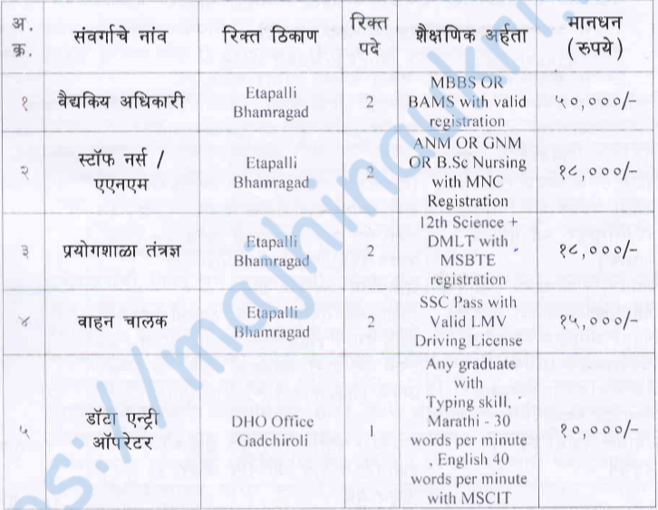 - Address for application – Office, National Health Mission, District Council Employee Colony, House No. B-2 (Slab), Complex Campus, Gadchiroli.